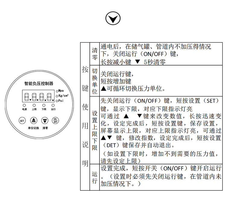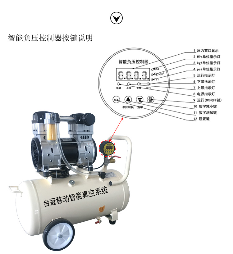 智能壓力控制器:高精度光電原理控制,0-負(fù)98KPA內(nèi)自由調(diào)節(jié)上限(停止),下限(啟動)。